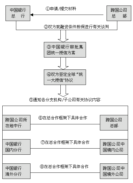 3.統(tǒng)一操作。統(tǒng)一談判:由中國銀行總行代表全球分支機(jī)構(gòu),跨國集團(tuán)總部代表全球子公司,統(tǒng)一談判授信條件、授信方式及合作細(xì)節(jié)。統(tǒng)一擔(dān)保:由跨國集團(tuán)總部提供統(tǒng)一的信用保證;統(tǒng)一評(píng)估:由中國銀行總行統(tǒng)一對(duì)跨國集團(tuán)的整體資信進(jìn)行評(píng)估與認(rèn)定;統(tǒng)一實(shí)施:根據(jù)雙方談判結(jié)果,由中國銀行總行及總分支機(jī)構(gòu)據(jù)此操作對(duì)跨國集團(tuán)總部及當(dāng)?shù)刈庸镜氖谛艠I(yè)務(wù)。