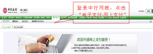 1、登錄中行網(wǎng)銀,點擊“電子支付-網(wǎng)上支付”選項。