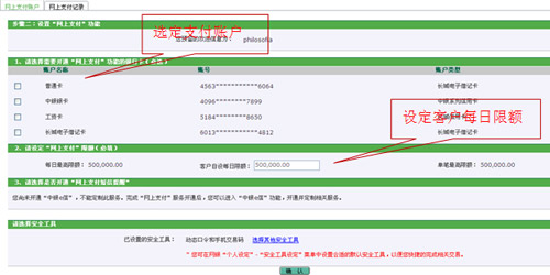 3、在您的網(wǎng)上銀行關(guān)聯(lián)賬戶中選定網(wǎng)銀支付賬戶,您可在銀行最大限額下設(shè)定客戶每日限額(您網(wǎng)上支付的交易限額還與商戶支持的卡類型及限額有關(guān),具體請參見商戶公告或頁面提示)。