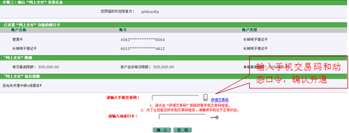 4、輸入手機(jī)交易碼和動態(tài)口令完成網(wǎng)上支付服務(wù)的開通。如您持有二代USBKey,可將USBKey插入電腦完成交易簽名與服務(wù)開通。