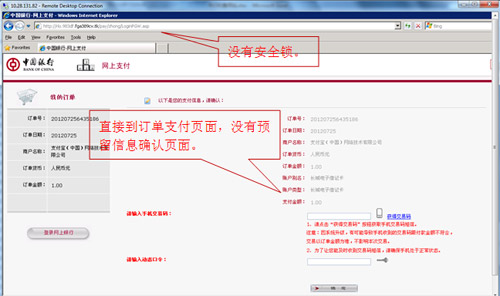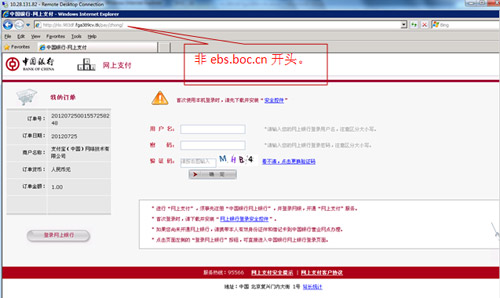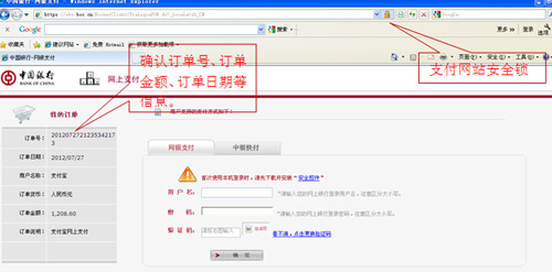 2、請仔細(xì)核對訂單號、訂單日期、訂單金額等關(guān)鍵信息,查驗登錄頁瀏覽器地址欄后是否有“安全鎖”標(biāo)志。核對無誤后再登錄中國銀行網(wǎng)上銀行進(jìn)行支付。