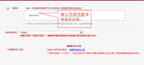 3、登錄中國銀行網(wǎng)上銀行,請首先確認(rèn)“預(yù)留信息”是否正確,再選擇付款賬號進(jìn)行支付。