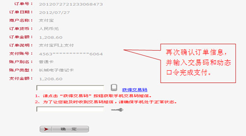 4、請再次核對訂單信息,核對無誤后再輸入手機(jī)交易碼和動態(tài)口令完成交易。如您持有二代USBKey,可將USBKey插入電腦完成交易簽名。