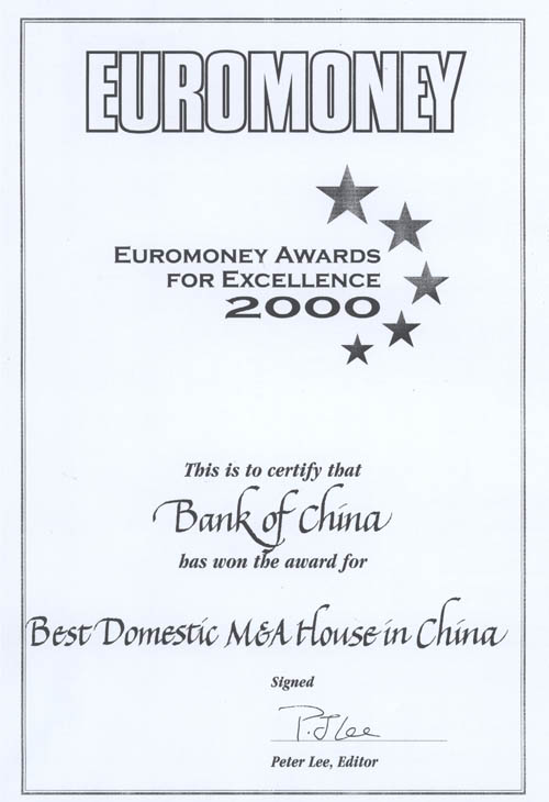 The certificate of the "Best Domestic M&A House in China" in 2000 awarded by the Euromoney.
