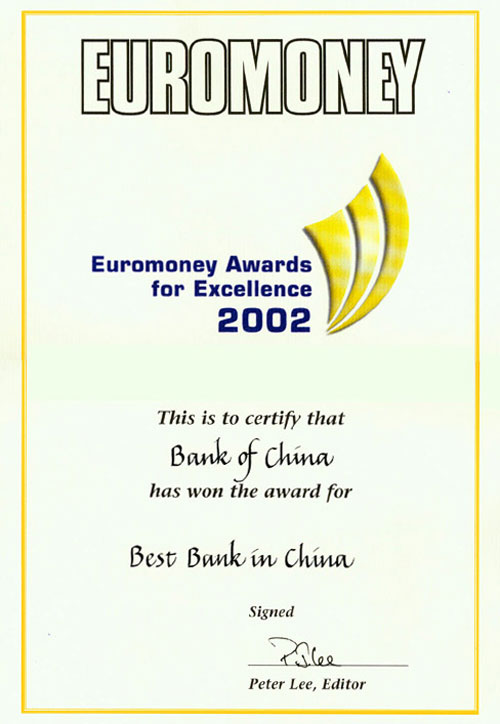 In the July 2002 issue of the Euromoney, Bank of China was named as the "Best Bank (China)".