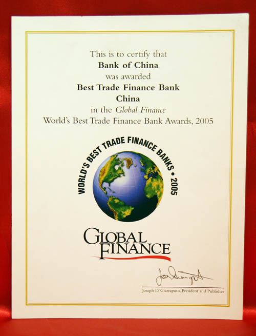 In the February 2005 issue of the Global Finance, Bank of China was named as the "Best Trade Finance Bank – China".