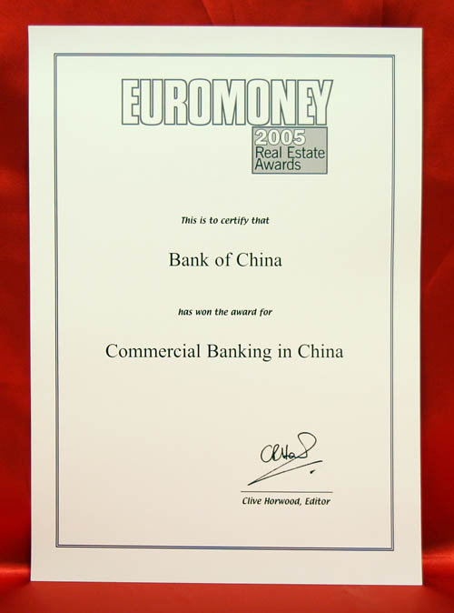 In the September 2005 issue of the Euromoney, Bank of China was named as the "Commercial Banking in China".