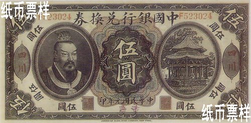 Following the issuance of redeemable notes bearing the portrait of Li Hongzhang in 1912, Bank of China issued redeemable notes bearing the portrait of Emperor Huang Di in one yuan, five yuan and ten yuan printed by American Bank Note Company for nationwide circulation.