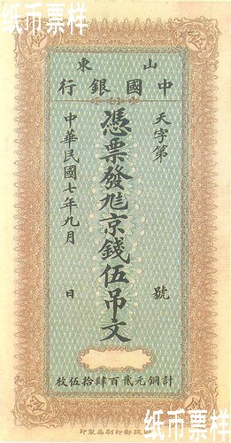In 1918, Shandong Province witnessed the circulation of copper cash notes in one thousand stringed cash, two thousand stringed cash and five thousand stringed cash, as well as the lengthwise copper coin note with the denomination of 100 copper coins, which were printed by the Bureau of the Engraving and Printing of Ministry of Finance.