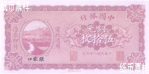 In 1919, copper coin notes in 10, 50 and 100 copper coins issued by Bank of China and printed by the Bureau of the Engraving and Printing of Ministry of Finance began to circulate in Zhangjiakou, Jiujiang and other places.
