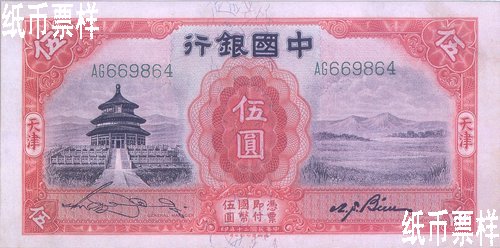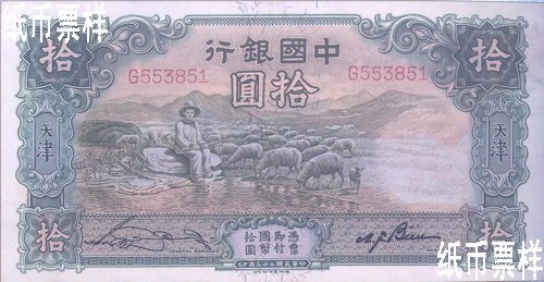 Bank of China issued a five-yuan national currency note of Tianjin in 1931, a ten-yuan one in 1934 and a one-yuan one in 1935, which were printed by Thomas De la Rue & Co., Ltd. The national currency notes of Tianjin with the domination of one yuan were issued in 1935, which were printed by Thomas De la Rue & Co., Ltd. A one-yuan national currency note with a farmer and cattle pattern printed by Thomas De la Rue & Co., Ltd. in 1934 was not issued for certain reason.