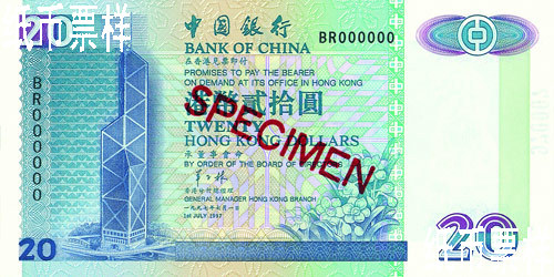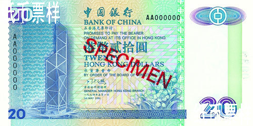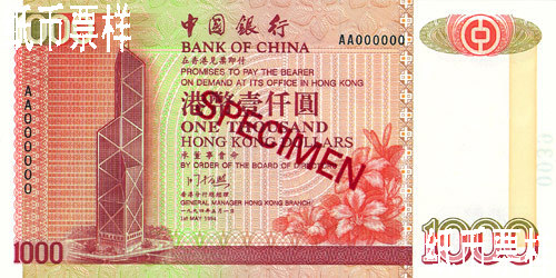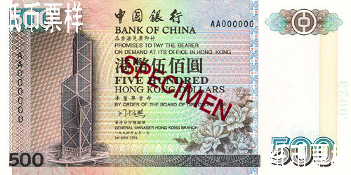 From 1994 to 1999, Bank of China issued Hong Kong notes in HKD 20, 50, 100, 500, and 1,000 printed by Thomas De la Rue (Hong Kong) and Hong Kong Note Printing Limited.
