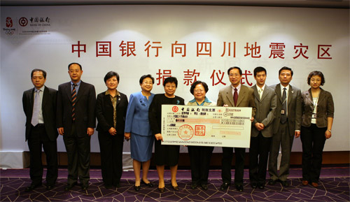 On May 14, 2008, a ceremony of donation for Sichuan quake relief was held at the meeting room on 10F of Bank of China head office mansion. Zhang Yanling, Vice President of Bank of China, handed a cheque for RMB 10 million to Wang Rupeng, Vice Chairman and Secretary General of Chinese Red Cross Foundation (CRCF). Peng Peiyun, Chairwoman of Red Cross Society of China (RCSC), then presented the donation award certificate and a medal to Bank of China.