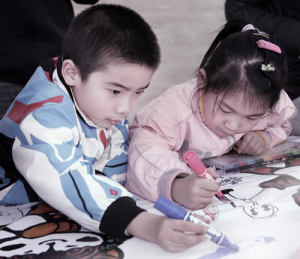 Picture on the right: Children from Chinese mainland, Hong Kong, Macau and Taiwan drawing pictures to convey their expectations to Beijing Olympic Games