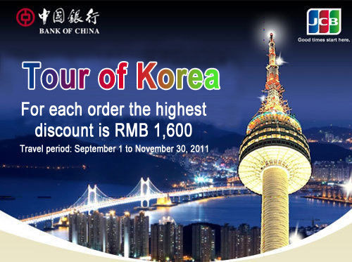 - (1) Call Ctrip Reservation Hotline 400-820-3300 or 800-820-3300 to inform the Bank of China JCB Credit Card number and book the exclusive route for the tour to Korea